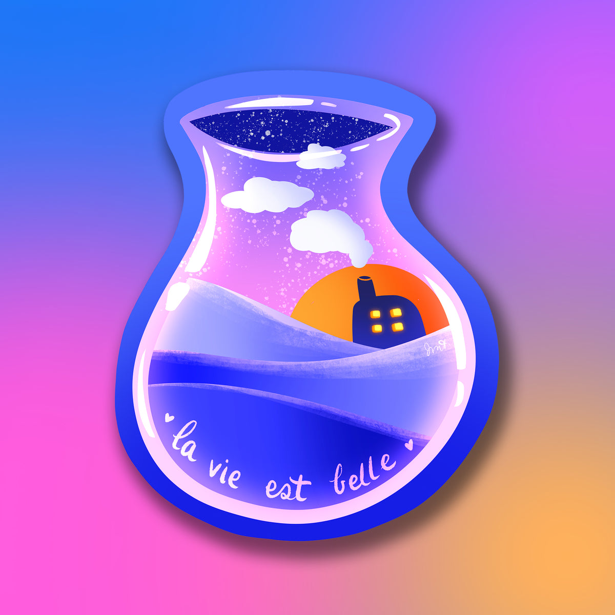 Sticker illustré par Jade Lachine, imprimé sur un matériau waterproof durable.